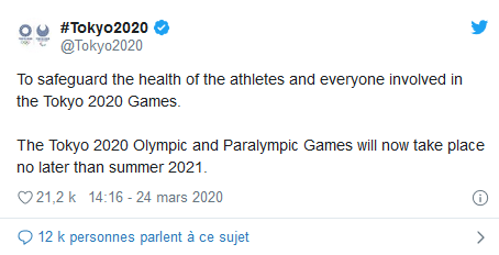 Le Comité International Olympique (CIO) a annoncé ce mardi 24 mars, le report des Jeux Olympiques 2020, prévus cet été à Tokyo.